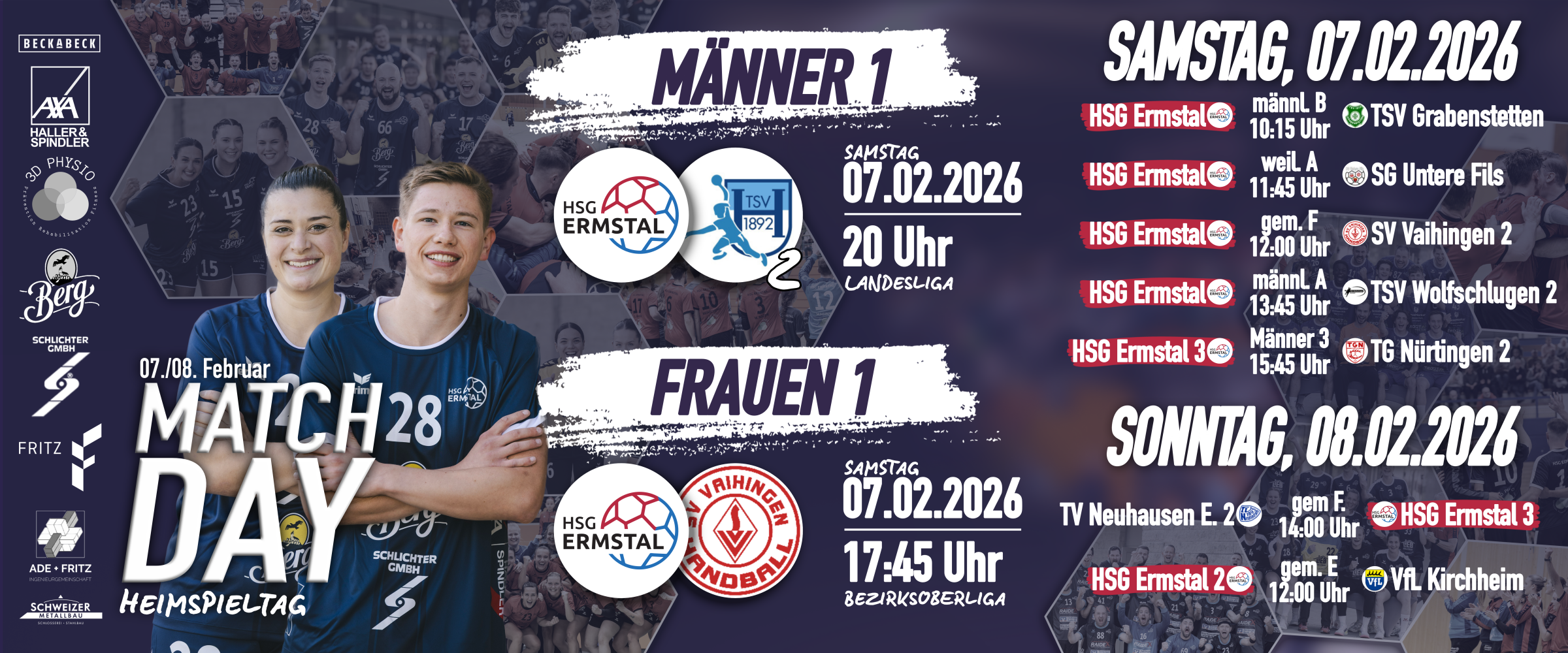 Am Samstag, den 07.02.2026, empfängt die HSG Ermstal um 20:00 Uhr den TSV Heiningen in der Neuwiesenhalle.