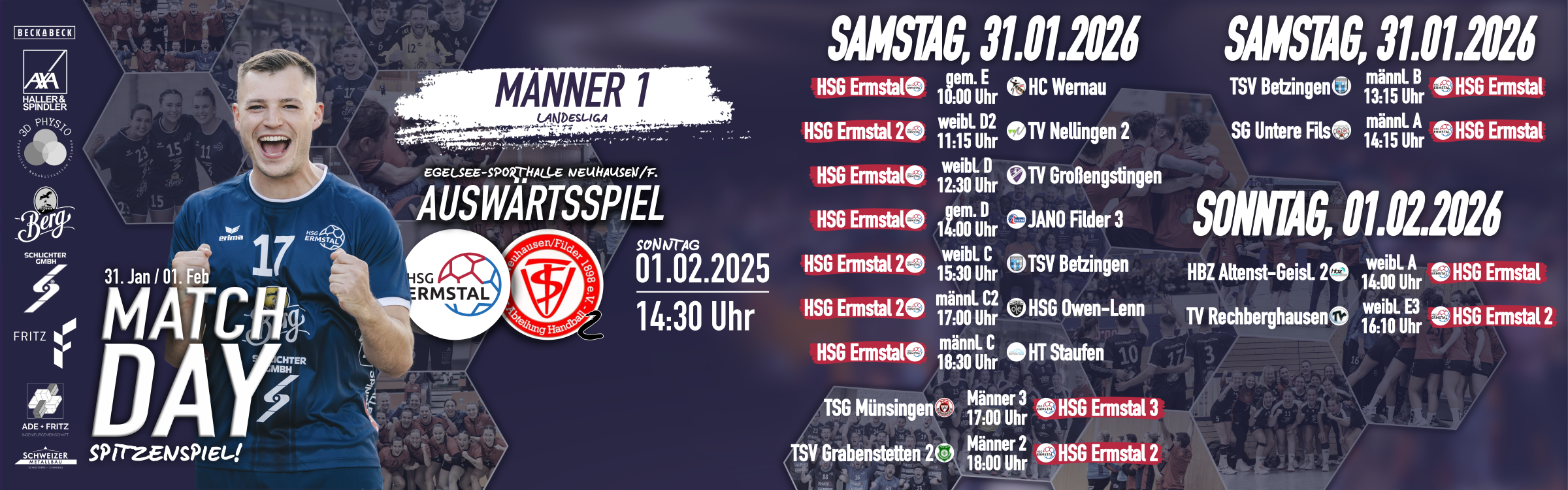 Am Sonntag, den 01.02.2026, steht für die Männer 1 der HSG Ermstal das nächste absolute Highlight der Landesliga auf dem Programm. Um 14:30 Uhr gastieren die Ermstäler auswärts beim Tabellenführer TSV Neuhausen/Filder 2 – ein echtes Spitzenspiel, das richtungsweisend für den weiteren Saisonverlauf sein kann.